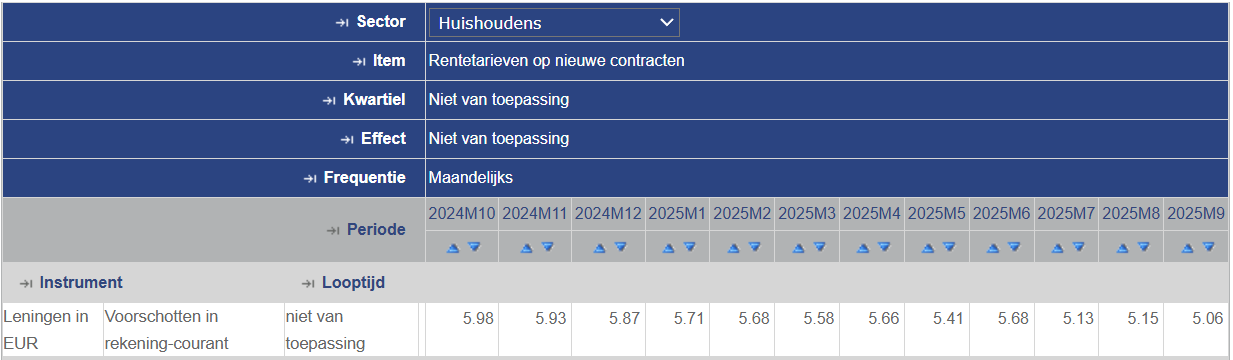De rentevoeten die worden gebruikt, zijn de maandelijkse rentevoeten die betrekking hebben op "Voorschotten in rekening courant" toegekend aan de sector "Huishoudens". De rentevoeten die in aanmerking worden genomen voor een inkomstenjaar X zijn de rentevoeten die betrekking hebben op de periode van oktober X-1 tot september X, teneinde de referentiepercentages zo snel mogelijk te kunnen berekenen en publiceren, rekening houdend met een redelijke publicatietermijn.